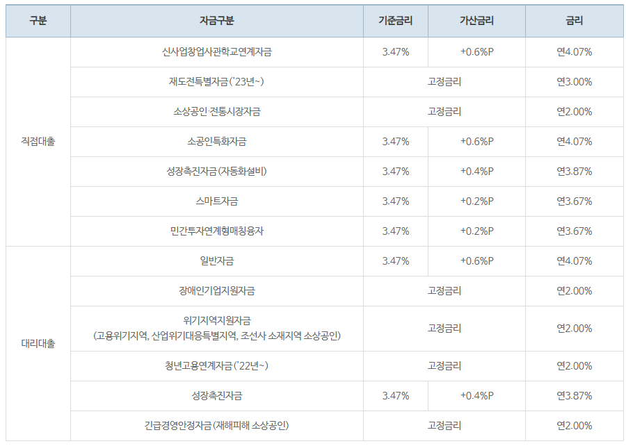 소상공인 정책자금 종류가 다양한 만큼 조건도 대출 상품에 따라 다릅니다. 기준금리는 연 3.53%에 자금종류에 따라 최대 0.6%까지 변동금리가 가산될 수 있습니다.